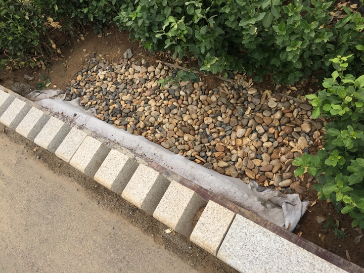 在沿园路及铺砌路面附近设置低于周边铺砌地面或道路在200 mm 以内的绿地。根据植物耐淹性及土壤的渗透性能,下凹深度在200mm左右。并结合实际情况设置适量的雨水口以保证暴雨时径流的溢流排放。
