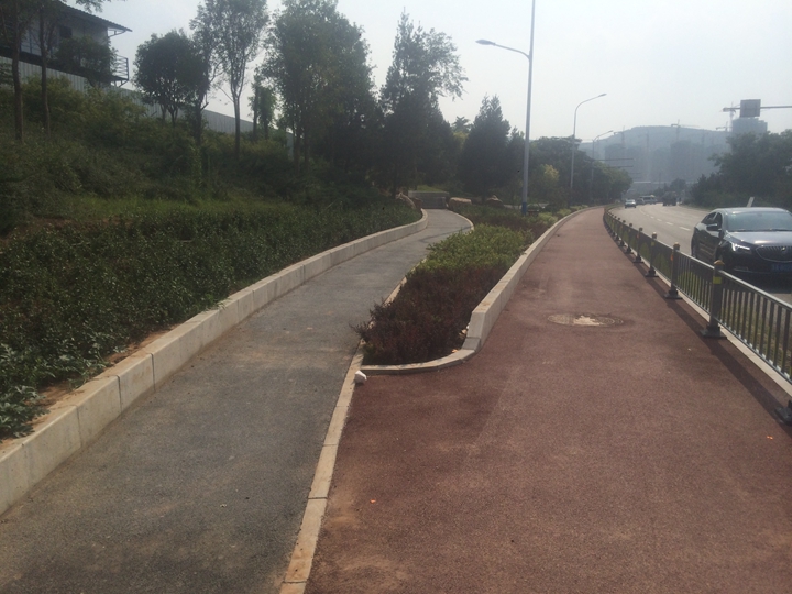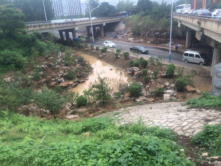 奥体西路南延原为断头路,道路红线范围及东西侧空间原状均为荒地,旅游路北桥北侧原为大辛河支沟上游河道。结合本次奥体西路南延道路工程建设,充分落实海绵城市建设理念,重点对桥下空间因地制宜进行挖潜,精心设计建设了1500余平方的生态水塘、植草沟、旱溪等海绵工程设施。通过对旅游路部分路段雨水进行断接,使上游区域雨水先进入生态水塘等设施进行生态净化和下渗,渗后多余的雨水再溢流进入大辛河支沟,彻底改变了该路段原有的雨水直排模式。